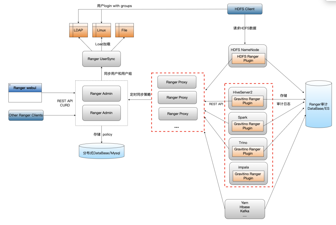 对于Hadoop体系下计算引擎的数据权限底层基本都是通过Ranger来实现授权和鉴权,但是Ranger的权限设计是基于组件(Service)做区分,不同引擎组件(Service)即使都共用同一个Hive的元数据库表,也要在Ranger上为每个不同的计算引擎创建相同语义的权限策略和Ranger Plugin插件,Ranger Plugin会定时同步该组件的全量策略到本地内存构建策略树进行本地鉴权,授权通过Ranger Plugin代理请求发送到Ranger Admin。
