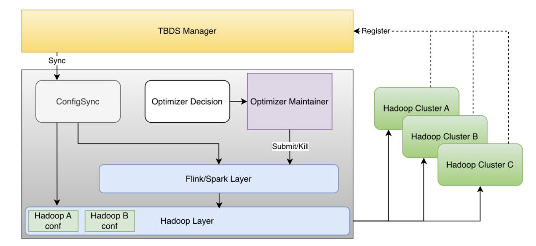同时 TBDS 目前提供了完备的 Open API ,TBDS管控侧的监听机制可以在 Hadoop 集群创建的初期自动化的将以上所有的配置文件自动化的注册到 Luoshu 组件上,实现 Catalog 的自动化接入注册,实现 Hadoop 创建过程中及联化接入。