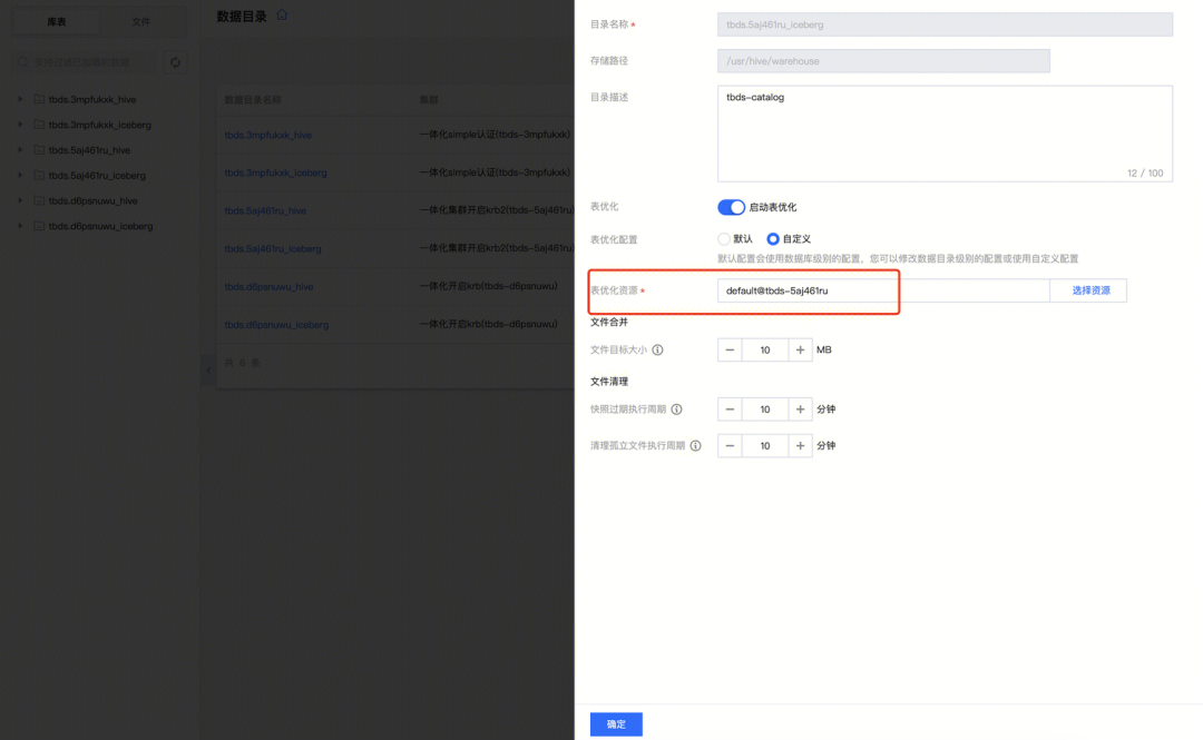 用户只需要在工作台编辑配置表的属性配置,即可无感将该表托管给 TBDS 的数据管理优化系统,TBDS 会根据预置策略全自动的托管该表的生命周期管理和优化。