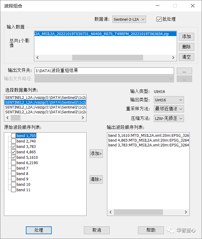 在软件中查找:菜单栏-》影像基本处理-》波段处理-》波段重组,弹出如下对话框: