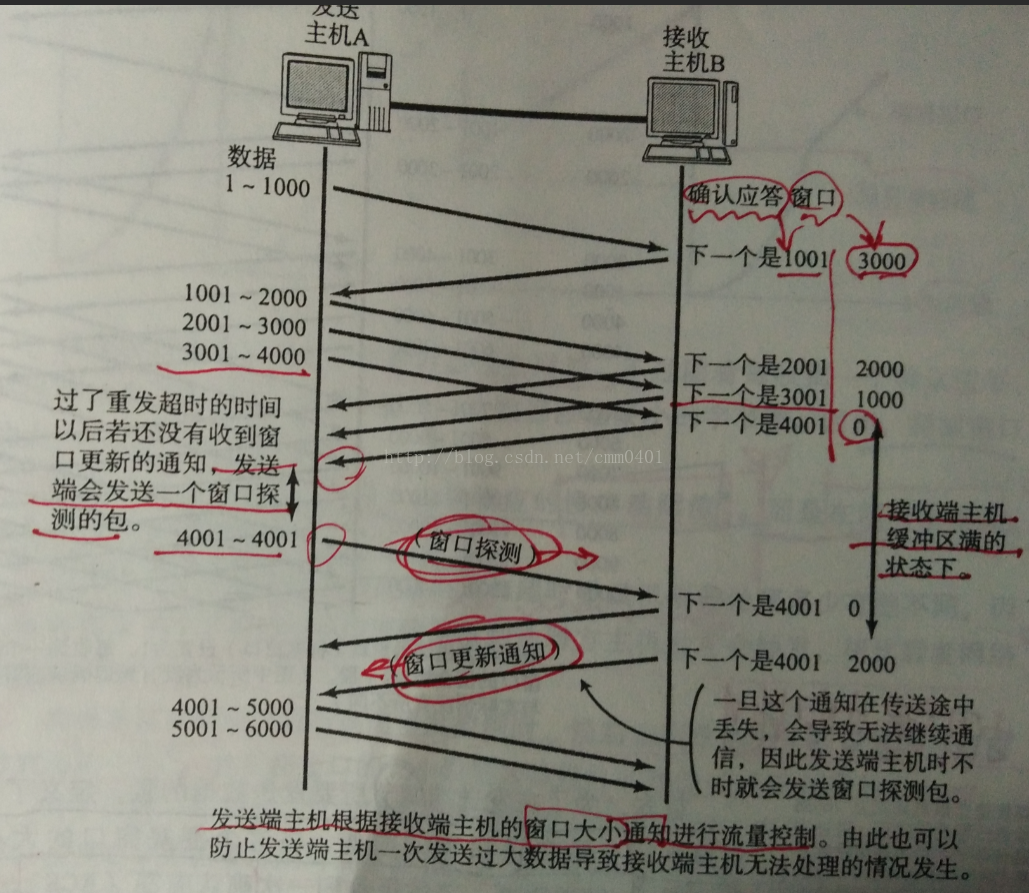 (3)如图11 所示:当接收端主机收到了从3001号开始的数据包之后其缓冲区即将满,不得不暂时停止接收数据,于是把窗口大小设置为0,然后通知该发送端。之后,发送端在收到新的窗口更新值的通知之后通信才得以继续进行。