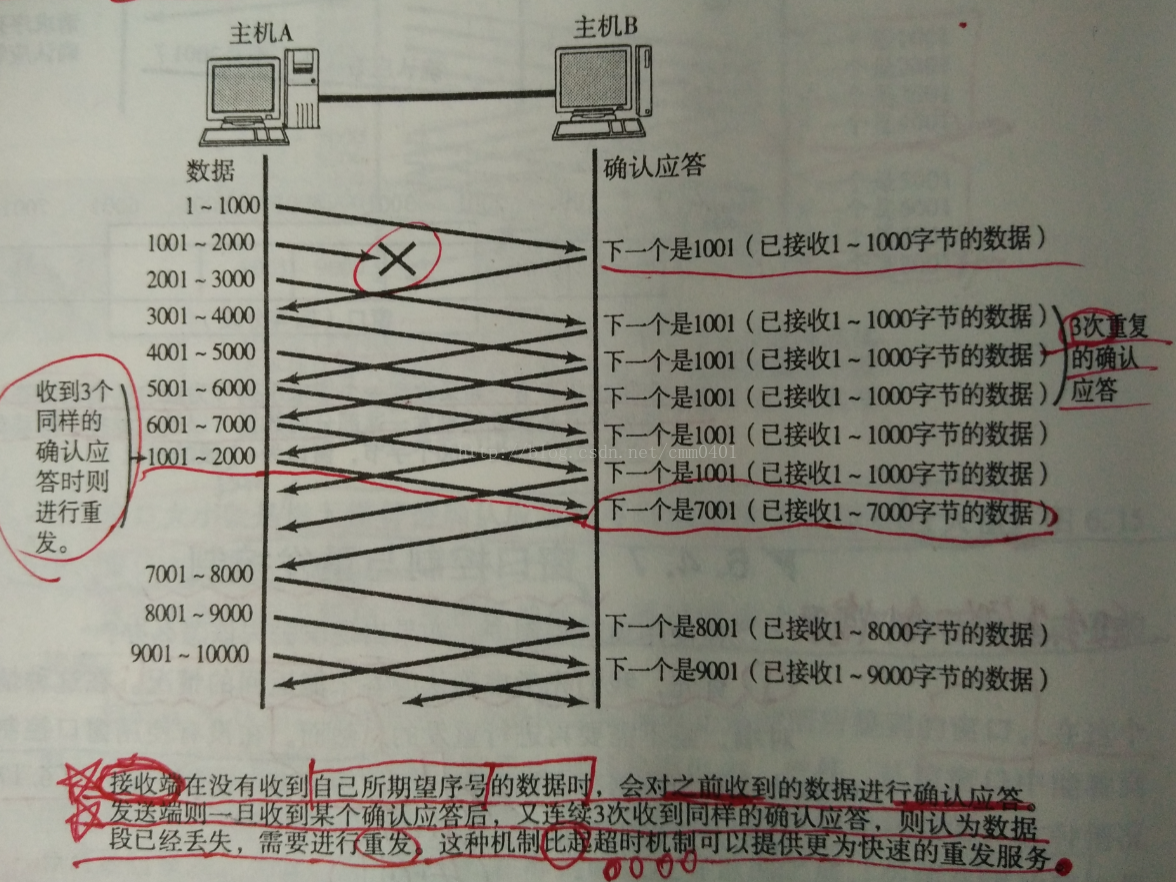 因此,如图10 所示:当某一个数据包丢失以后,发送端会一直接收到序列号为1001的确认应答包,这个确认应答包好像是在提醒发送端主机“我现在想要接收的数据包序列号是1001开始的”。