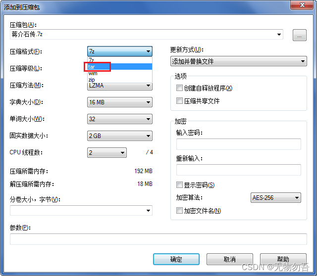 [转载]Windows如何压缩tar.gz格式 所以需要做第二步,再在这个tar文件上面点右键,选“7-ZIP”->“添加到压缩档案”,这时候弹出的窗口里再看“压缩格式选项”,发现多了两个刚才没有的,其中就包括“gzip”,然后选“7-ZIP”->“添加到压缩档案”,在弹出来的窗口里有个“压缩格式”的选项,里面并没有tar.gz格式,没关系,里面有一个Tar格式,第一步就是要先压成tar格式。二、成功打包为Tar文件后,你可能会发现这个tar文件包和原来的文件大小一样,也就是说tar本身并没有压缩,而是仅仅把它们打包成一个单独的Tar文件。