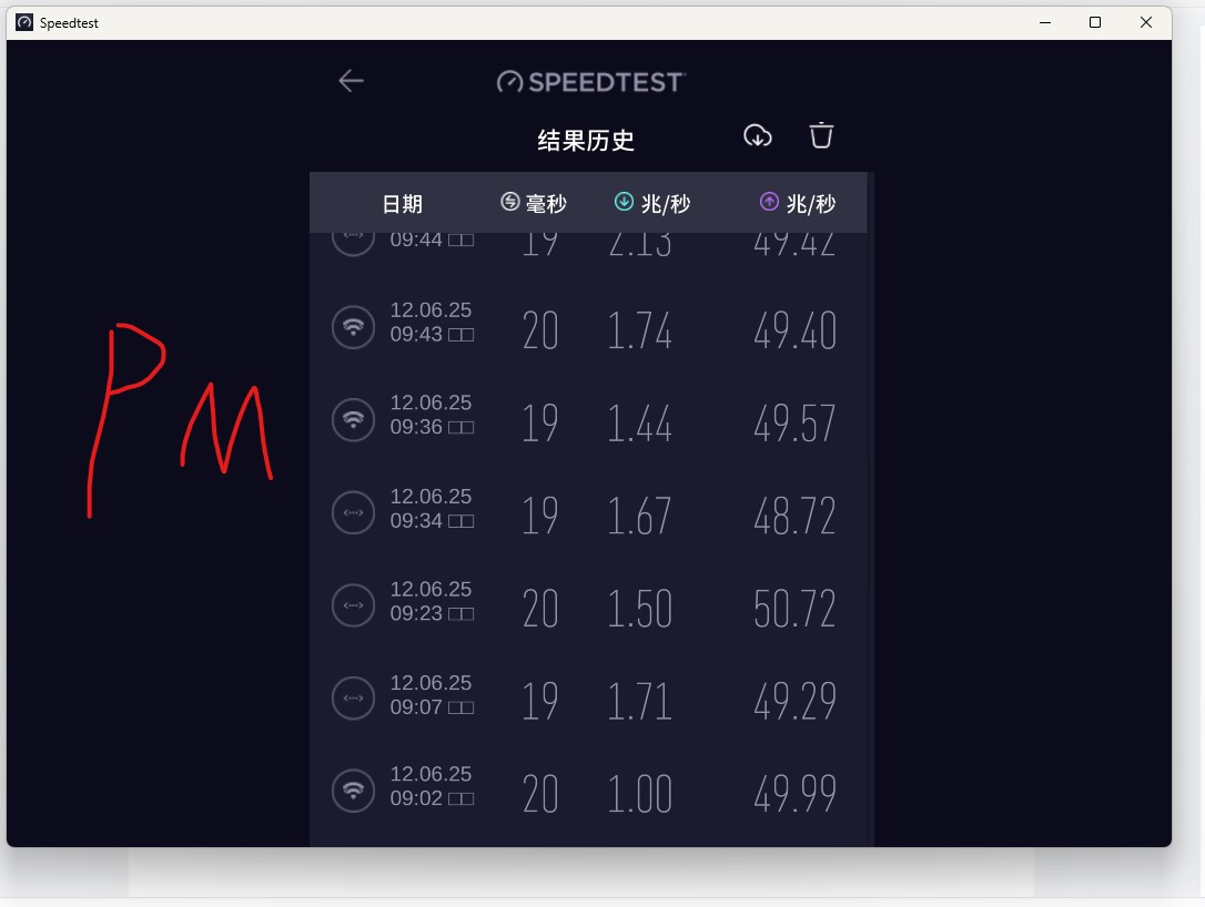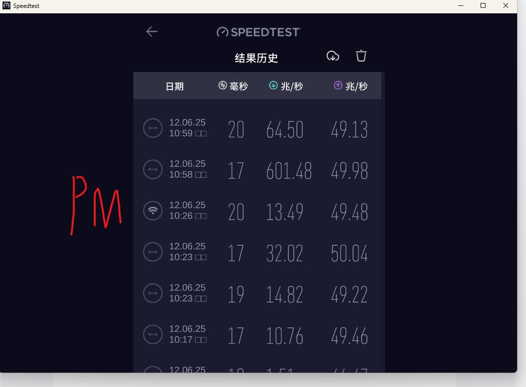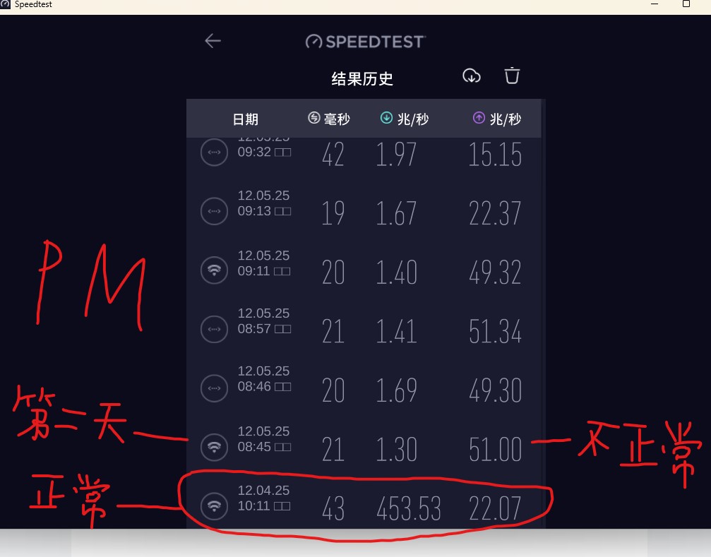 我的情况是电脑用speedtest,手机用信通测速,联通带宽是500(测速值统一用的Mbps),同一条光纤同一个光猫下,电脑(包括笔记本)直连光猫或者光猫后加华硕21年出厂的一个千兆电竞路由器会出现大部分白天的情况会跑满四五百、五六百之间波动,晚上有时候能跑满,但晚上大部分时间都是只有1-10Mbps左右,我平时晚上下班到家七八点、八九点开始测,然后手机,华为的不论什么时间都能跑满四五百、五六百Mbps,iqooz5今天晚上借的装机师傅的工作手机测的和华为一样能跑满,iqooz8测了几天没有跑满过(同一个光猫,同一个路由器,光纤和宽带线用设备测过,光猫换成wifi7的万兆一体光猫,都没问题),把华硕路由器换成万兆光猫带5Gwifi功能测出来的结果和换之前一样,今天测是九点开始测,师傅也喊来测(各种排除问题),测到十点 半多,还是那样,机房也问过,等十点多师傅走了,十一点我又用台式电脑测了一遍,这时候又恢复到五六百了,笔记本也恢复了。不知道明天晚上还会这样吗!(目前有几个推测)一是IP会不会被限制网速了(平时只玩玩游戏、看看剧,看看b站)毕竟设备和设备同一个网速度不一样,二是这是在住宅楼上,会不会这个时间段用户量大或者楼内有网络作业者(目前知道移动的网大概率是一个单元一个箱子),三是软件限制,平时电脑后台只有腾讯电脑管家、微信、b站、网页(Edge),测速时后台都会关掉,隐藏的或者我不知道的什么软件大概率不会有,但也不排除这个情况(但不是一直都掉网速,八月份一次这十二月份一次,中间一直没事),平时除了玩玩游戏(STEAM\EPIC\腾讯)、b站、腾讯视频、网页追剧没别的什么。目前找不到因为什么原因,时不时掉速,大部分是晚上。