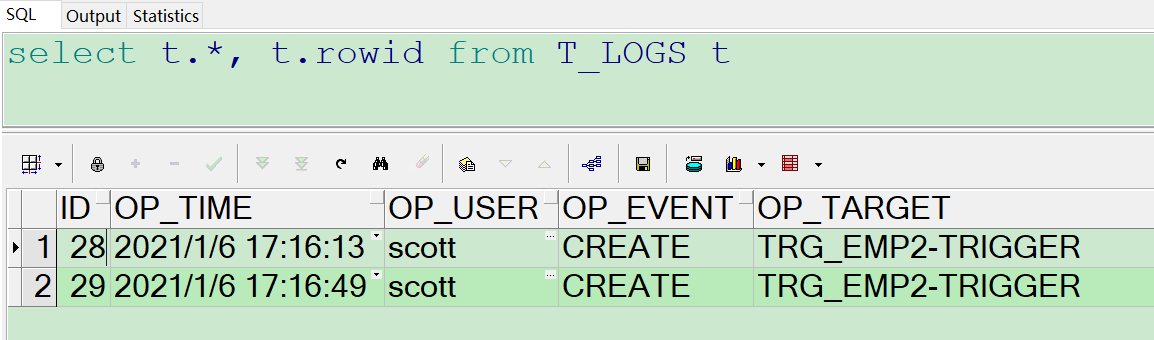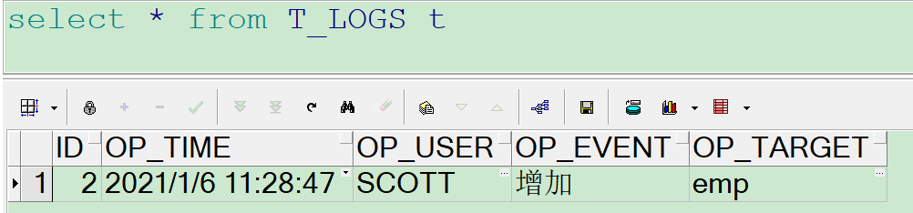 用scott账号登录数据库,查看t_logs表可以看到刚才scott登录的日志。