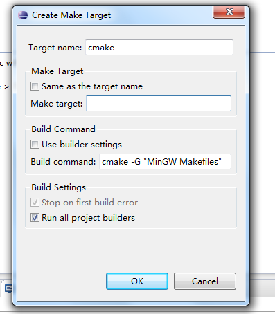 添加标签 cmake,在选项卡的目录上点击右键,选择New弹出对话框,按照下图修改。取消Same as the target name选项,清空Make target中的内容,取消Use builder settings选项,在Build command中填写cmake -G “MinGW Makefiles”