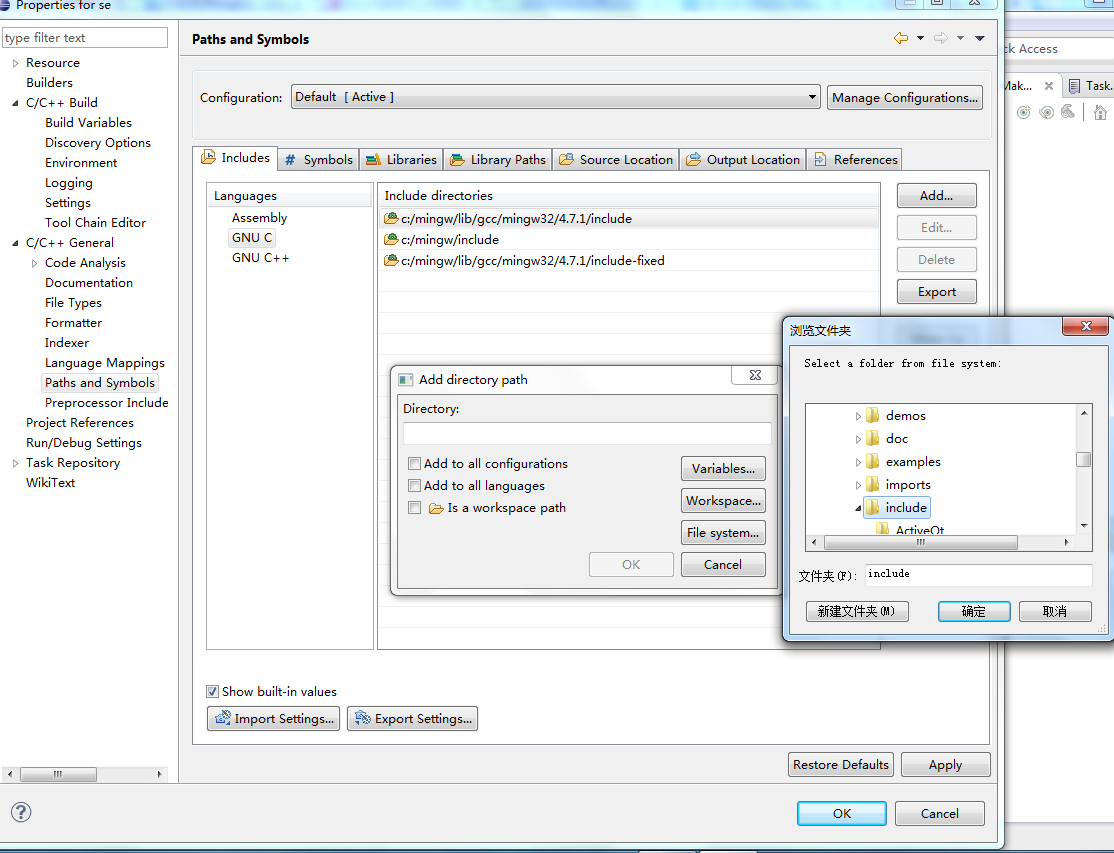 将Qt include目录添加到系统搜索路径,添加Qt的library到link目录,include的添加主要是为编辑器补全来使用,library的添加不是必须的,编译过程的所以依赖都是通过makefile来控制与IDE无关。在Properties中选择C/C++ General下的Path and Symbols节点,选择Include选项卡,选中Gnu C++,点击Add,将需要添加的include的目录添加到eclipse的搜索路径下。选择Library Path选项卡,点击Add,添加需要的library目录,选择Library选项卡,点击Add,添加需要链接的library,这两步在不使用eclipse自身的构建时是无效的,所以这两步的设置不是必须的。