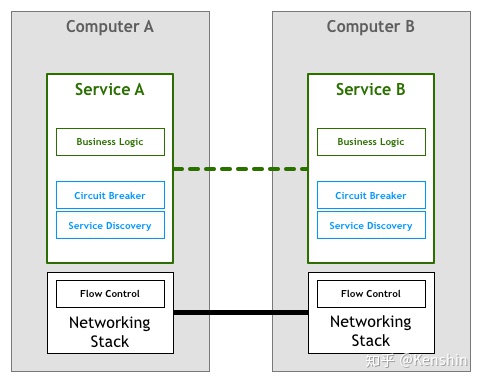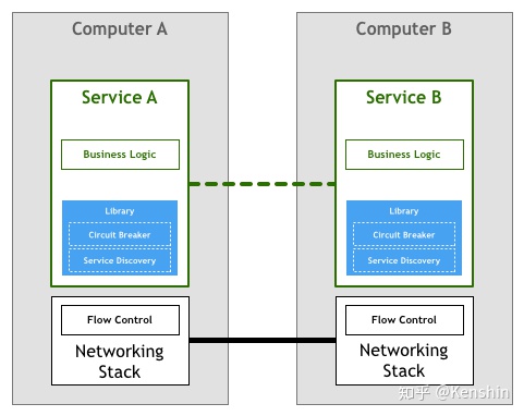 在TCP出现之后,机器之间的网络通信不再是一个难题,以GFS/BigTable/MapReduce为代表的分布式系统得以蓬勃发展。这时,分布式系统特有的通信语义又出现了,如熔断策略、负载均衡、服务发现、认证和授权、quota限制、trace和监控等等,于是服务根据业务需求来实现一部分所需的通信语义。