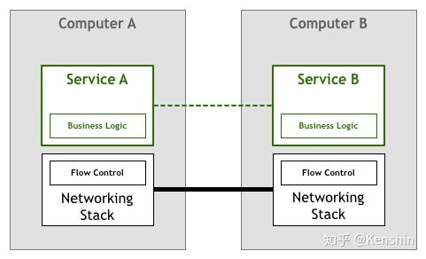 然而现实远比想象的复杂,在实际情况中,通信需要底层能够传输字节码和电子信号的物理层来完成,在TCP协议出现之前,服务需要自己处理网络通信所面临的丢包、乱序、重试等一系列流控问题,因此服务实现中,除了业务逻辑外,还夹杂着对网络传输问题的处理逻辑。