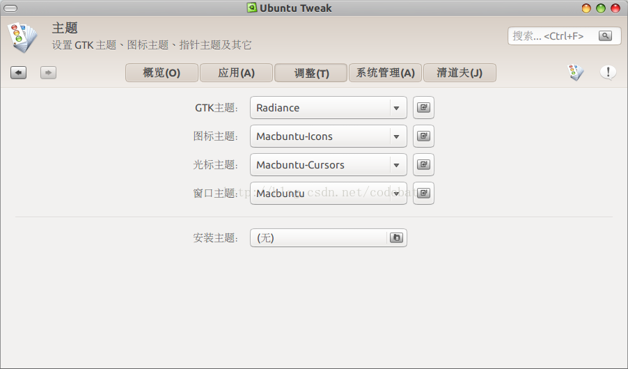 安装后打开tweak工具,设置GTK主题为Radiance,图标主题,窗口主题,光标主题均改为Mac即可.