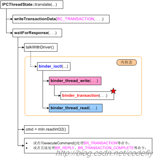 在上一篇文章中,我们大体阐述了一下binder_thread_write()和binder_thread_read()的唤醒与被唤醒关系,而且还顺带在“传输机制的大体运作”小节中提到了todo队列的概念。本文将在此基础上再补充一些知识。需要强调的是,我们必须重视binder_thread_write()和binder_thread_read(),因为事务的传递和处理就位于这两个函数中,它们的调用示意图如下:
