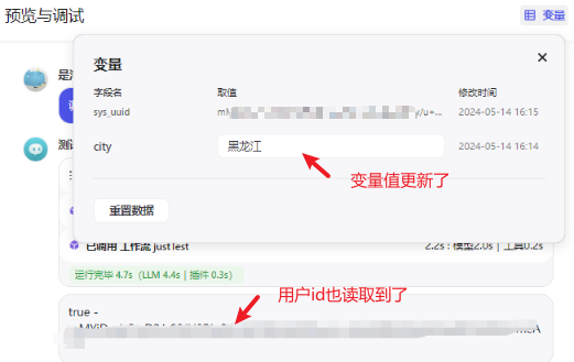 然后在 预览与调试,回复一句:我在深圳,可以看到,变量设置成功: