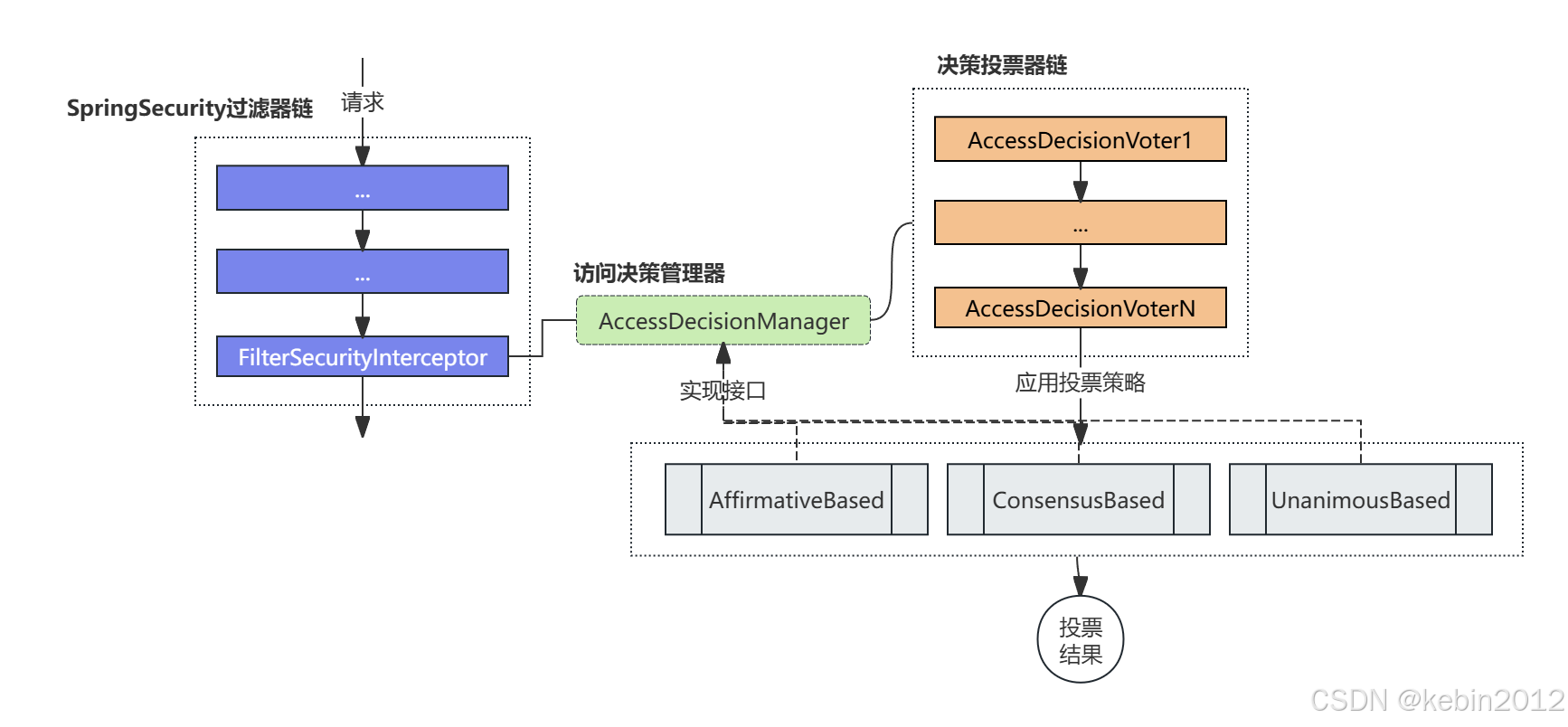 访问决策管理器内置了一个投票器(AccessDecisionVoter)列表,访问决策管理器根据这些投票器遍历执行的结果决定是否允许访问,这种责任链设计模式在ss框架中被广泛应用。访问决策管理器目前有三种实现:AffirmativeBased、ConsensusBased、UnanimousBased,分别代表不同的投票策略。框架默认使用的是AffirmativeBased,它采用了一票通过的策略——即只要有任意一个投票器投票结果为通过(ACCESS_GRANTED),则该请求获得访问权。