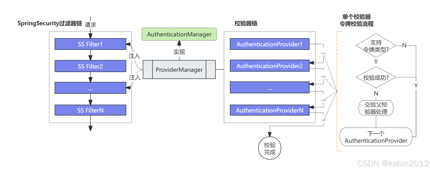 令牌校验由 AuthenticationManager 的默认实现类 ProviderManager 完成。ProviderManager内置了一个由多个校验器(AuthenticationProvider)组成的列表(List)。校验过程中,列表内的校验器按排列顺序依次执行,并将校验结果返回对应的过滤器。
