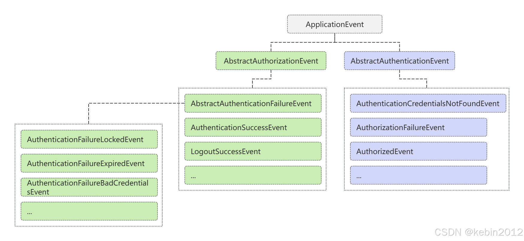 ss的事件处理基于Spring自带的事件机制。ss框架中的事件分为两大类型:令牌验证事件(AbstractAuthenticationEvent)、授权验证事件(AbstractAuthorizationEvent),前者代表身份验证过程中的各种事件,如校验成功、退出登录等;后者代表用户权限检查过程中的各种事件,如授权通过、授权拒绝。
