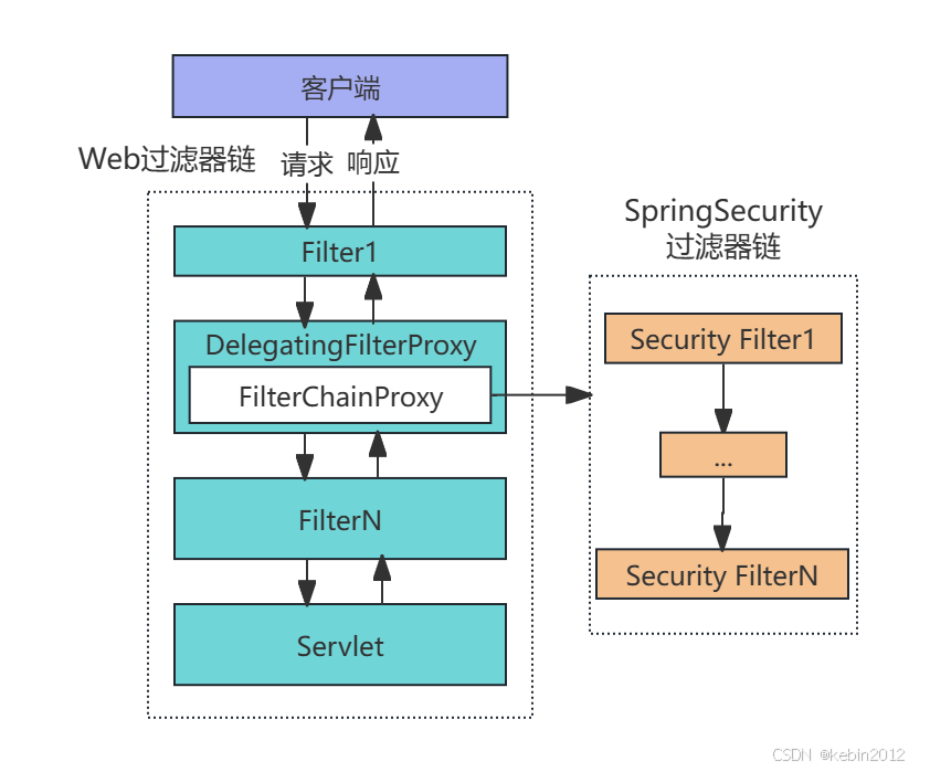 FilterChainProxy内部也定义一条过滤器链,因此Web应用中实际有两条过滤器链,一条是基于Servlet标准的Filter过滤器链,一条是ss框架内部的虚拟过滤器链。虽然两条链中的过滤器都是继承自 javax.servlet.Filter,生命周期和执行方式却不尽相同,前者生命周期由Web容器托管,按过滤器优先级依次处理Http(s)请求;而后者由Spring容器托管,按虚拟链的排列顺序依次处理封装过的鉴权请求。