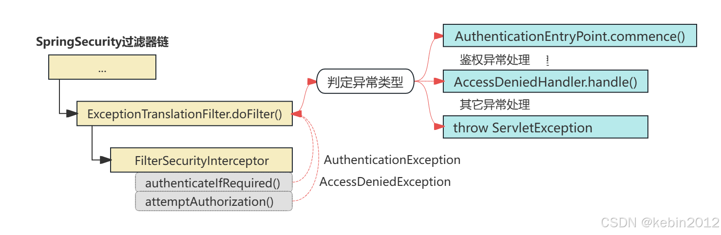 ExceptionTranslationFilter 只能捕获排在其后的过滤器抛出的异常,由于默认情况下它处于过滤器链的倒数第二位置,意味着它只能捕获 FilterSecurityInterceptor 抛出的异常(FilterSecurityInterceptor 会执行令牌校验和授权验证,因此两类异常都可能抛出)。