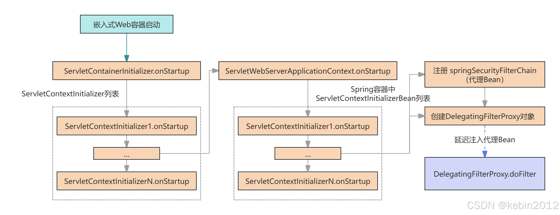 ss处理请求的入口是一个实现了J2EE Servlet 规范的过滤器(DelegatingFilterProxy,实现了 javax.servlet.Filter 接口)。早期的项目须在web.xml中进行相关配置,web容器启动时就会加载并初始化这个过滤器。Springboot兴起后,以 ServletContainerInitializer 为基础的配置方式逐渐取代了web.xml的配置方式,Springboot项目中ss过滤器的加载流程如下图所示: