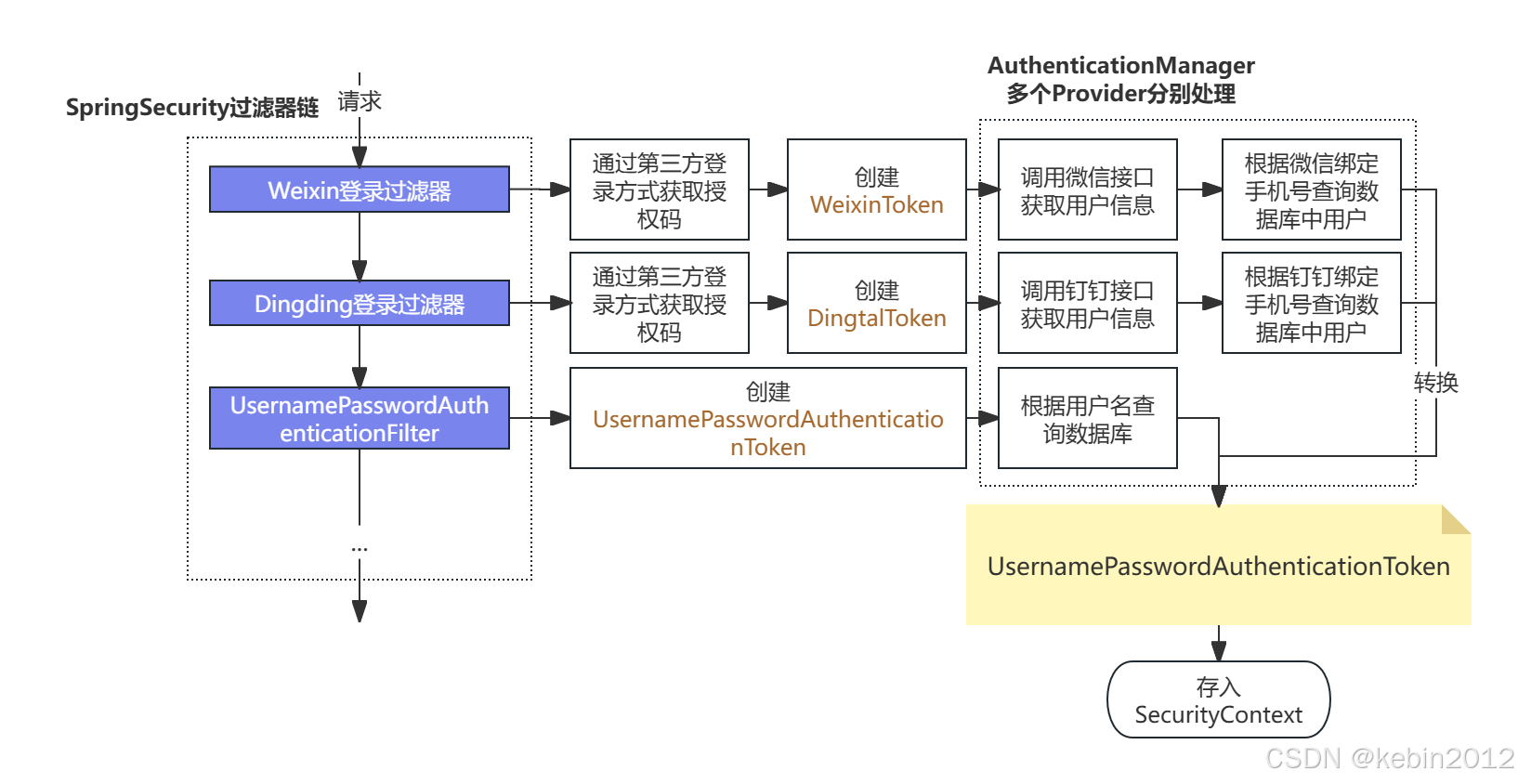 从图例可以看出,尽管不同过滤器(微信、钉钉、用户名密码)处理请求时生成的令牌不尽相同,但经过一系列的处理,这些令牌校验成功后最终转换为统一的令牌类型(UsernamePasswordAuthenticationToken),这样做有助于后续编写统一的授权验证逻辑,如果业务需要展示用户登录方式或第三方账户信息,可以在令牌转换时将第三方账户信息附加到新的令牌上。