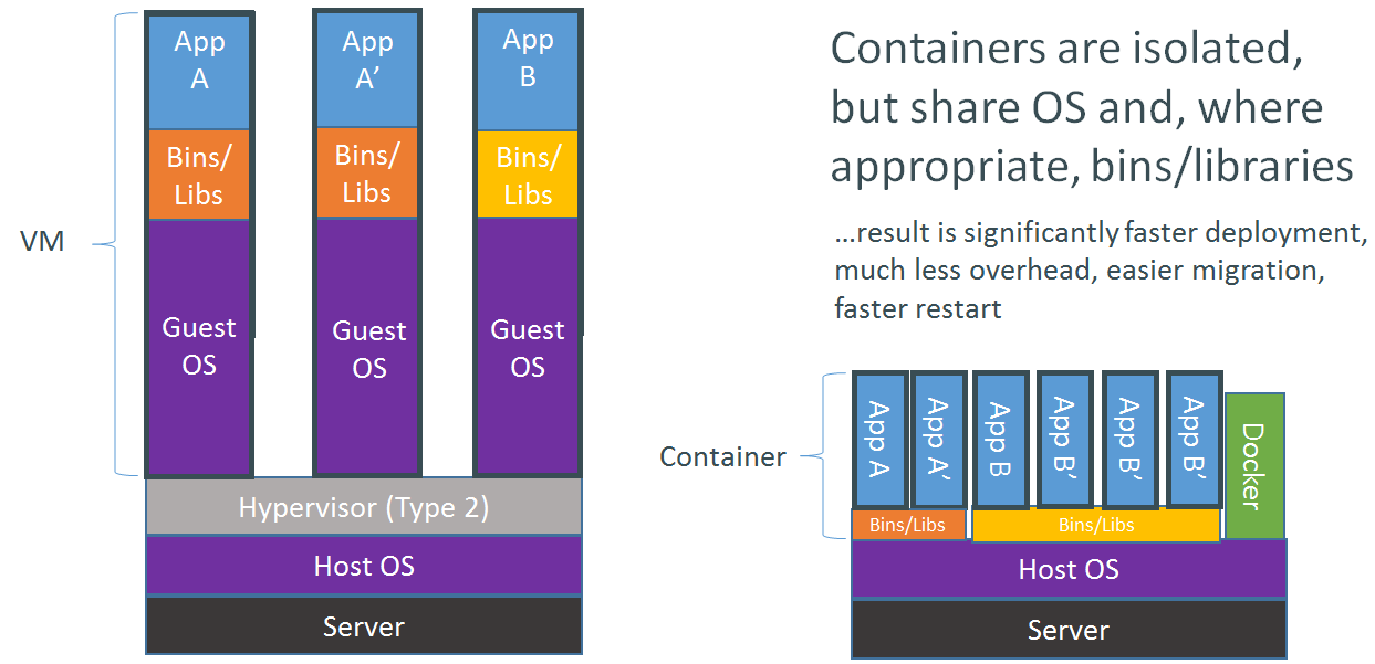 普通虚拟机将整个操作系统运行在虚拟的硬件平台上, 进而提供完整的运行环境供应用程序运行, 而Docker则直接在宿主平台上加载运行应用程序. 本质上他在底层使用LXC启动一个Linux Container,通过cgroup等机制对不同的container内运行的应用程序进行隔离,权限管理和quota分配等