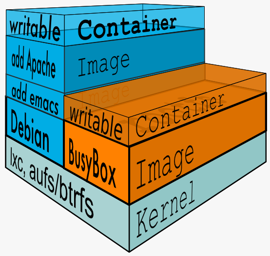 为了最大化重用Image,加快运行速度,减少内存和磁盘footprint, Docker container运行时所构造的运行环境,实际上是由具有依赖关系的多个Layer组成的。例如一个apache的运行环境可能是在基础的rootfs image的基础上,叠加了包含例如Emacs等各种工具的image,再叠加包含apache及其相关依赖library的image,这些image由AUFS文件系统加载合并到统一路径中,以只读的方式存在,最后再叠加加载一层可写的空白的Layer用作记录对当前运行环境所作的修改。