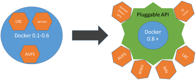 虽然Docker目前默认使用LXC和AUFS,但是Docker的核心思想本身,并不强制绑定这两者,0.8版本已经可以使用BTRFS,而整个Docker框架也改成了插件式的架构,便于添加替换各个功能模块