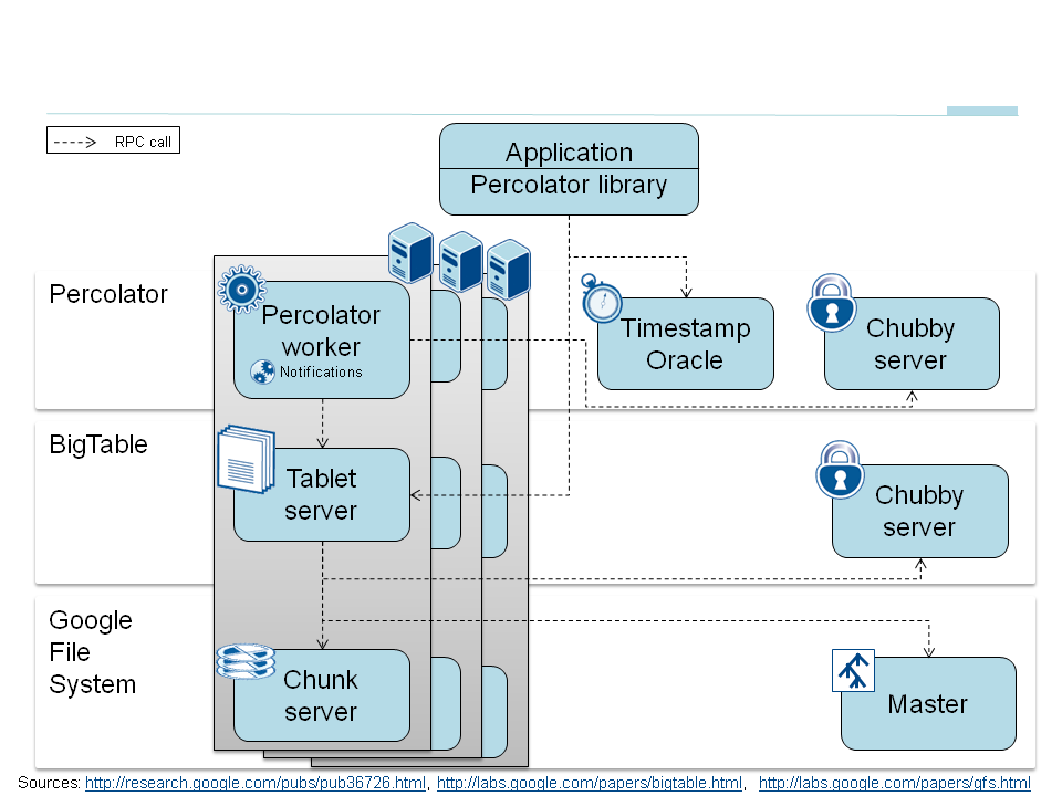 而两阶段提交对锁的管理产生的额外需求(主要是对失效worker遗留的锁的清理)是通过Chubby server对worker的状态监测来支持的。 综上,整个Percolator的系统组件框图(引用自官方相关PPT)如下: