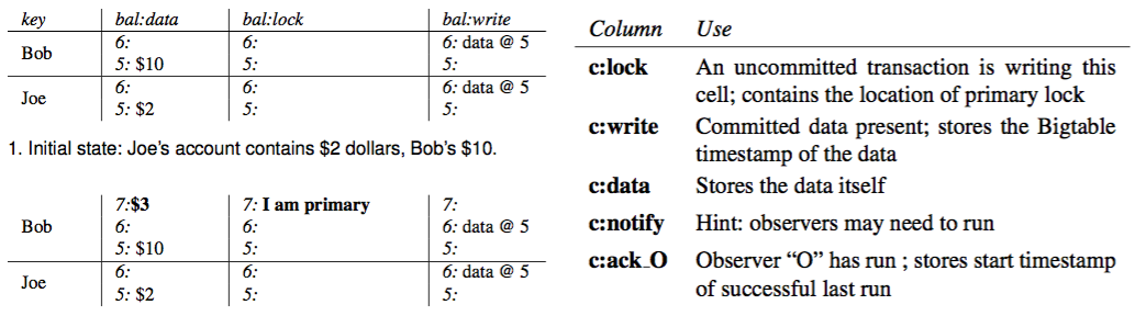 实现上,percolator的分布式事务两阶段提交是通过在BigTable表内部每行数据中添加额外的column来标记相关的锁信息的。