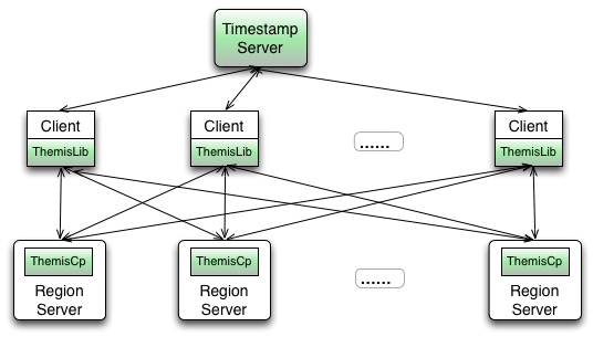 总体架构上与Percolator不同的地方是在事务的实现方面,不完全是在client Librery中,单行的事务处理基本是通过Hbase Coprocessor来实现的(比如对字段加锁,清除锁之类),在客户端client library中不需要相关的处理逻辑。