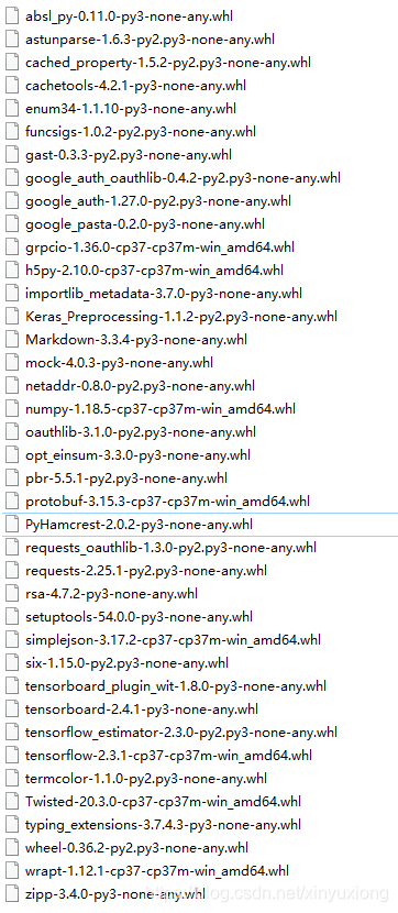 之前在别的文章中见到有人分享了离线安装tensorflow所依赖的包,本人实际安装过程中又多出了一些,可能跟安装各个组件的版本有关系,本人安装的是Anaconda3-5.3.1-Windows-x86_64.exe,cuda_10.1.243_426.00_win10.exe,cudnn-10.1-windows10-x64-v7.6.2.24,tensorflow-2.3.1-cp37-cp37m-win_amd64.whl,依赖包共38个,整理如下: