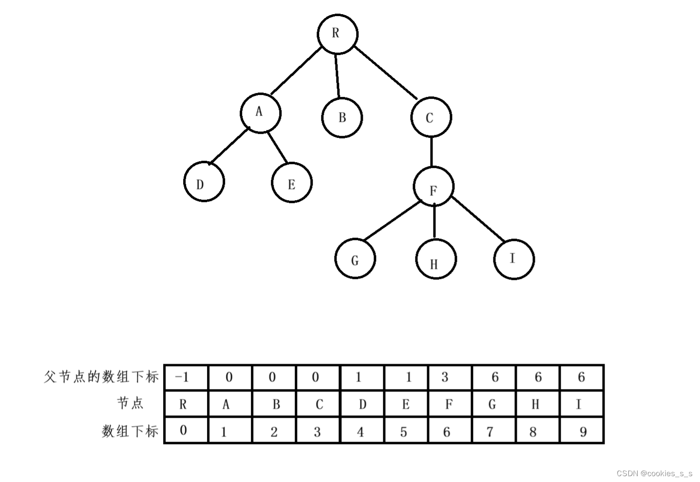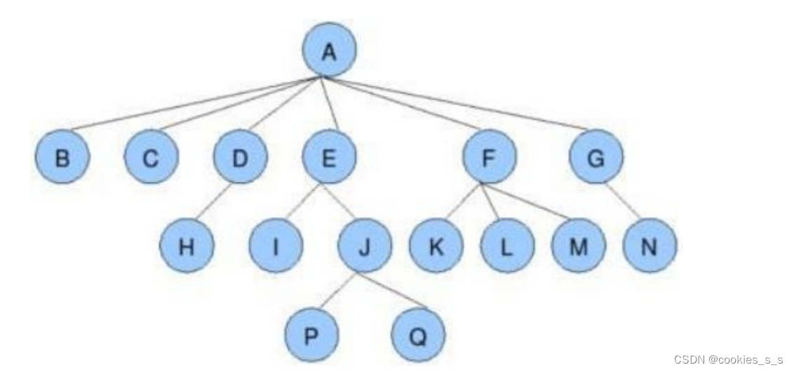 子孙:以某节点为根的子树中任一节点都称为该节点的子孙。如上图:所有节点都是A的子孙