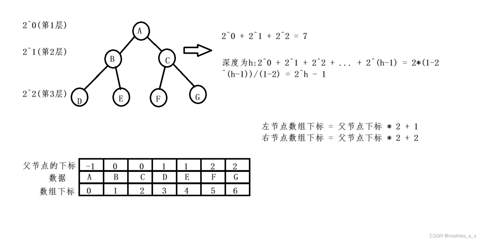 6.2 若规定根节点的层数为1,则深度为h的二叉树的最大结点数(满二叉)是2^h- 1(等比数列求和)