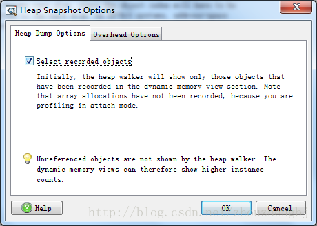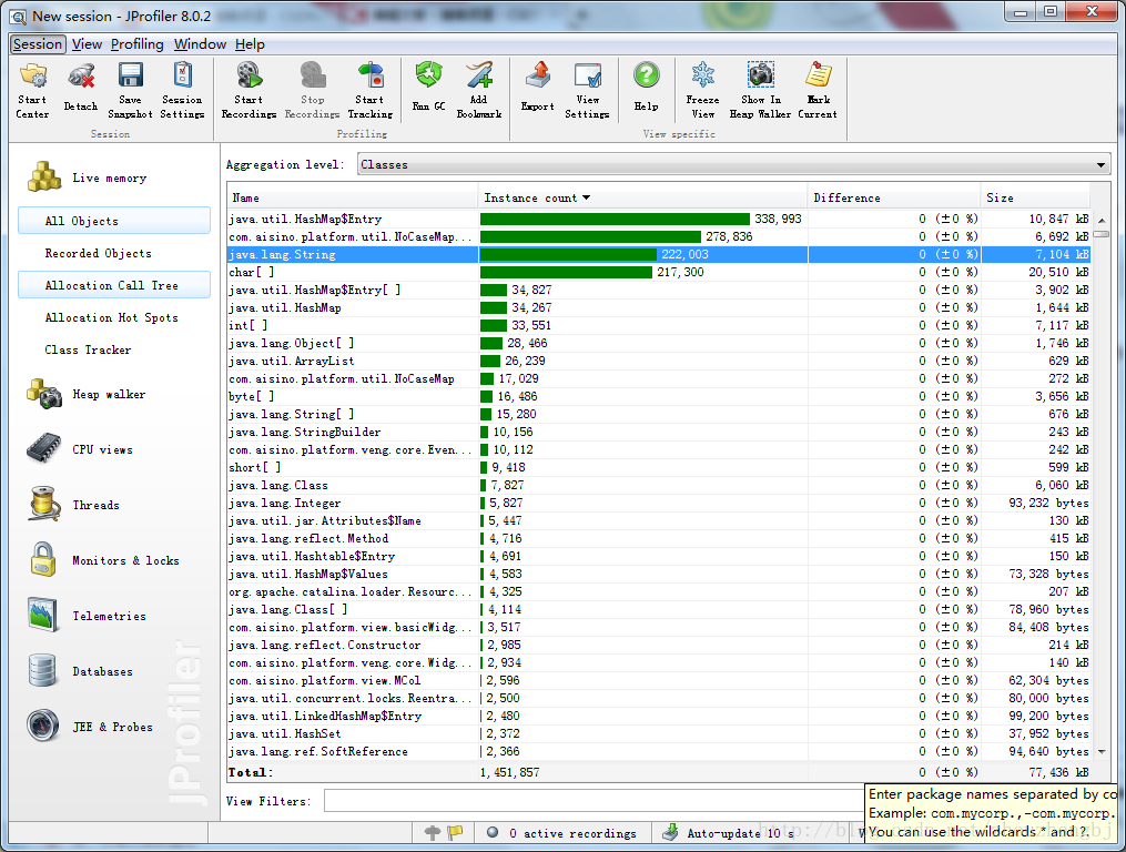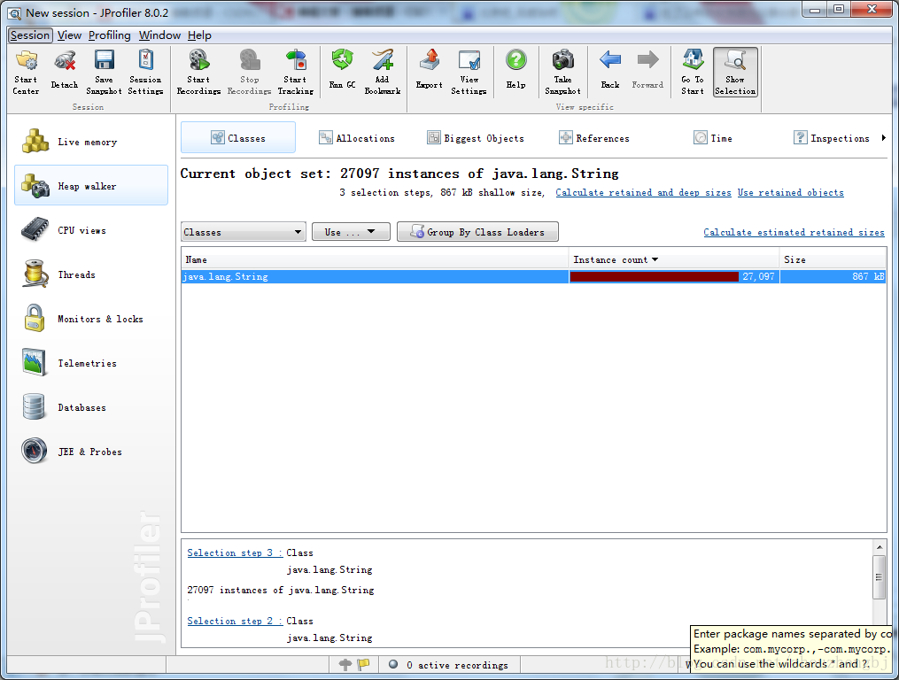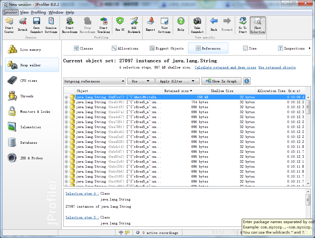 点击“Start Recordings”按钮,开始记录。执行这步的主要目的是为下面“Heap Walker”,设置一个监控区间;如果不记录的话,“Heap Walker”将分析jvm虚拟机的所有内存,即耗时又不能准确的发现内存泄漏的原因。