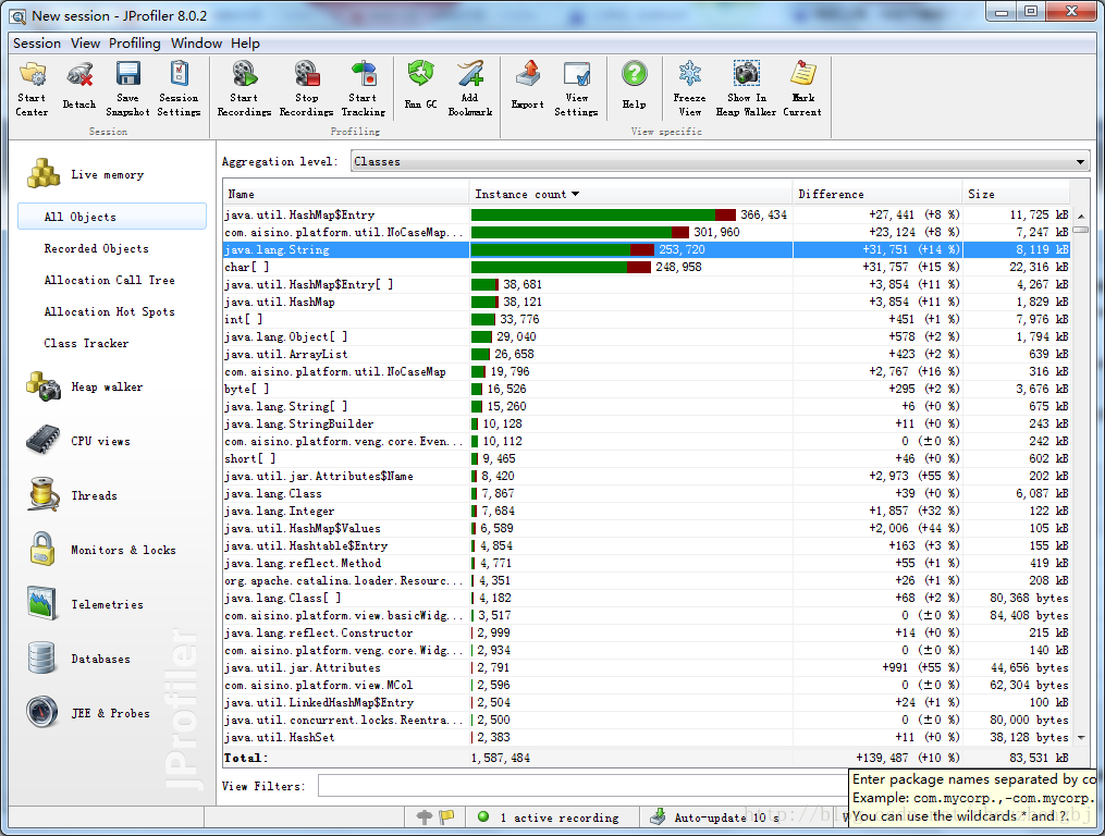 切换到“Live Memory-->All Objects”标签,可以看到当前tomcat中的对象情况。