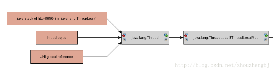 在上图中,我们可以发现,这个String对象最终的引用是在Thread线程中的ThreadLocalMap对象中;这给我们提供了线索,我们需要在程序中查找有关ThreadLocalMap部分的代码,检查为什么这个对象没有被释放;这往往就是泄漏的根源。
