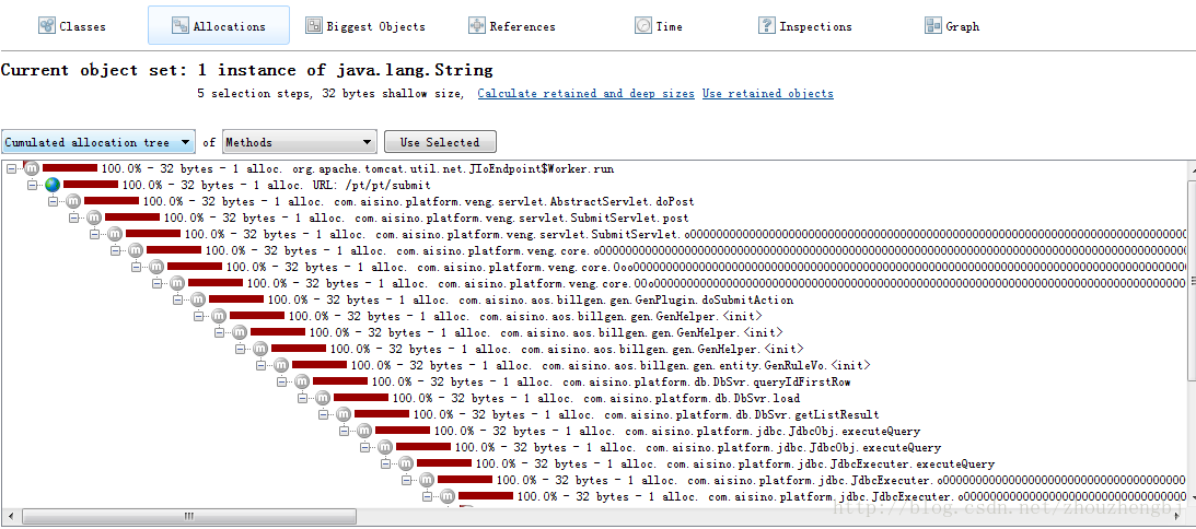 执行内存回收后,仍然存在于内存中的对象有可能是泄漏的对象;如下图,instance count中红色的部门为不能回收的对象,difference列列出了增加的对象数量和增幅;以String为例,在该操作中增加了31751个对象,增幅达到了14%,随后会在HeapWalker中观察这些对象,分析哪些对象是泄漏的;
