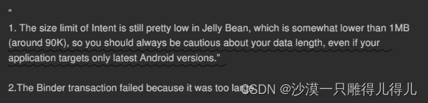 bundle的数据传递是有⼤⼩限制的,查阅了官⽅⽂档,官⽅解释