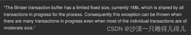 简单来说,我们上面提到了Parcel机制使用了一个共享内存, 这个共享内存就叫Binder transaction buffer,这块内存有一个大小限制,目前是1MB,而且是整个进程共用的,当超过了这个大小就会报错。