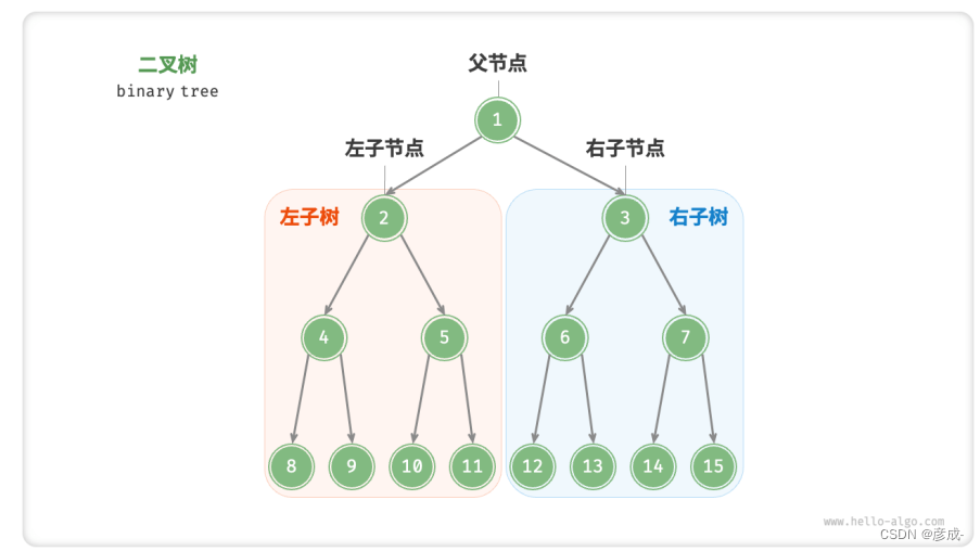 树:二叉树、AVL树 二叉树 binary tree」是一种非线性数据结构,代表着祖先与后代之间的派生关系,体现着“一分为二”的 分治逻辑。与链表类似,二叉树的基本单元是节点,每个节点包含:值、左子节点引用、右子节点引用。每个节点都有两个引用(指针),分别指向「左子节点 left‑child node」和「右子节点 right‑child node」,该节点被称为这两个子节点的「父节点 parent node」。