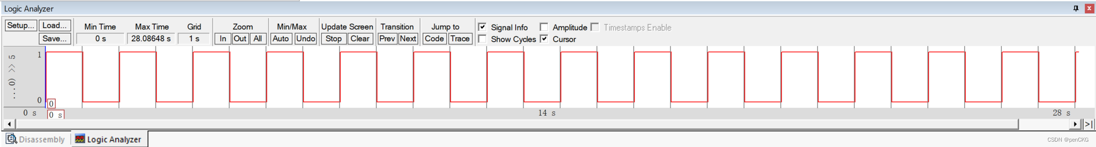 在Logic Analyzer中添加A5端口并设置为位显示,运行,得如下波形图:第一个周期内0 ~ 1s为高电平1,1 ~ 2s为低电平0;以2s为一个周期如此循环。
