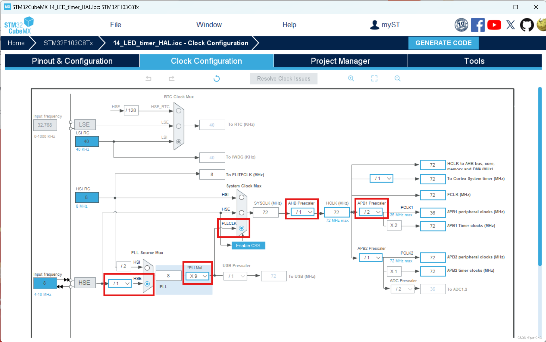 在Clock Configuration界面中,设置PLL Source Mux为HSE,设置System Clock Mux为PLLCLK,并按下图标记设置数值。