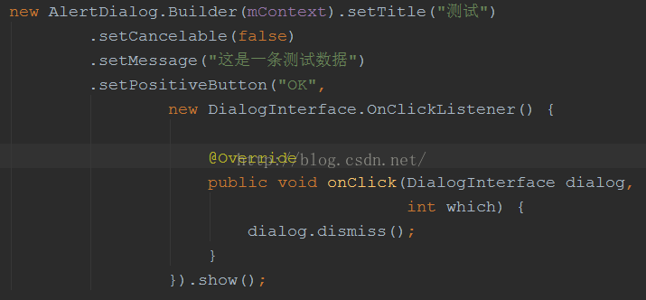 参数为Context类型,根据上面的代码,传入的也是Context类型参数,貌似没有什么问题。其实不然,getApplicationContext()获得的context为整个应用的上下文,而对于AlertDialog来说,是需要依赖一个View,而View是对应于Activity的。所以,一般传入应该为Acitivity.this。