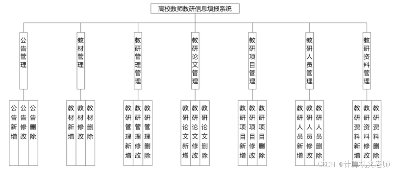 图4.1即为设计的管理员功能结构,管理员权限操作的功能包括管理公告,管理高校教师教研信息填报系统信息,包括教材管理,教研项目,教研资料管理,公告等,可以管理教研项目。