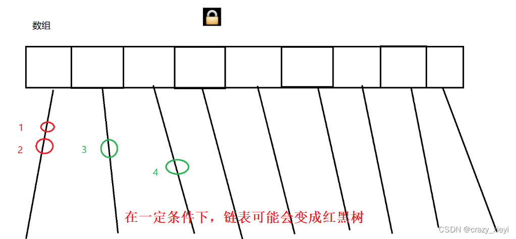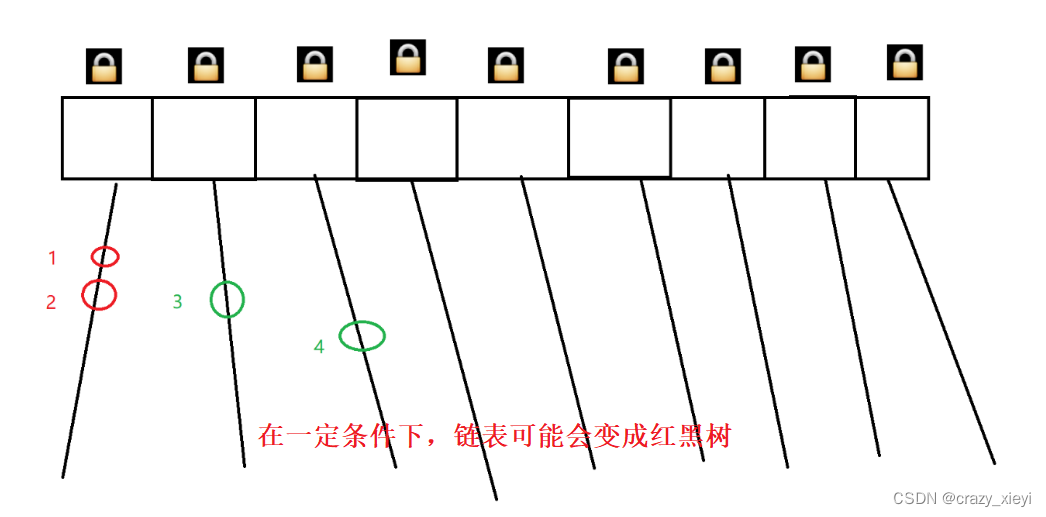 此时元素1和元素2在同一链表上,如果线程A修改(增删)元素1,线程B修改元素2,那么此时是有线程安全问题的(相邻两元素并发的插入或者删除的时候,相邻两节点的next指向可能会发生改变)。如果线程A修改(增或者删)元素3,线程B修改元素4,,这个情况相当于多个线程修改不同的变量,那么此时是没有线程安全问题的。