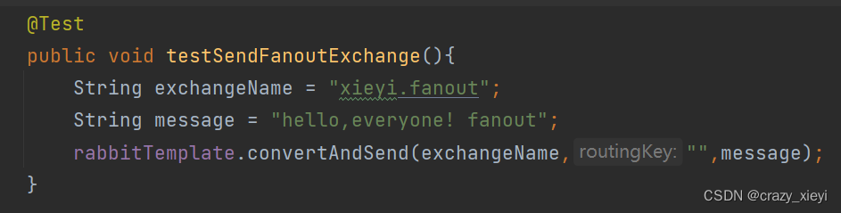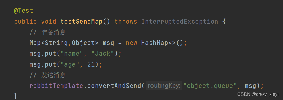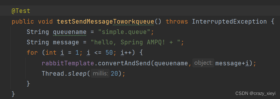 在publisher服务中编写测试类SpringAmqpTest,并利用RabbitTemplate实现消息发送: