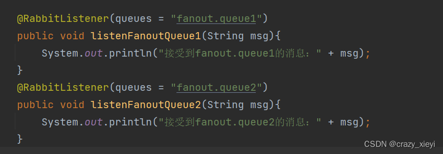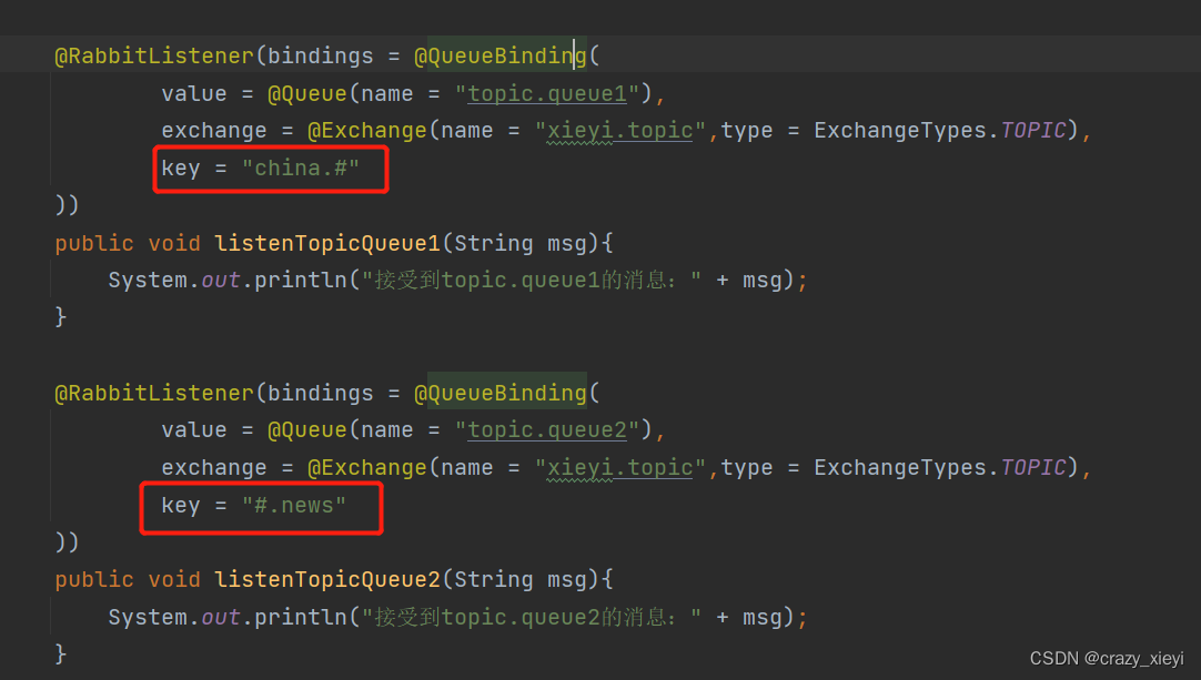 在consumer中添加两个消费者,同时基于注解来声明队列和交换机: