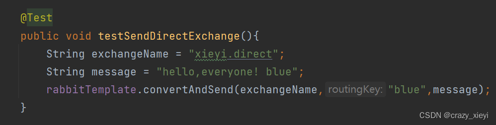在Direct模型下:队列与交换机的绑定,不能是任意绑定了,而是要指定一个RoutingKey(路由key);消息的发送方在 向 Exchange发送消息时,也必须指定消息的 RoutingKey;Exchange不再把消息交给每一个绑定的队列,而是根据消息的Routing Key进行判断,只有队列的Routingkey与消息的 Routing key完全一致,才会接收到消息。