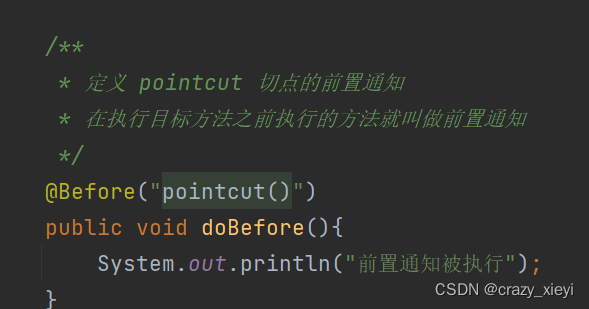 前置通知使⽤@Before:通知⽅法会在⽬标⽅法调⽤之前执⾏。