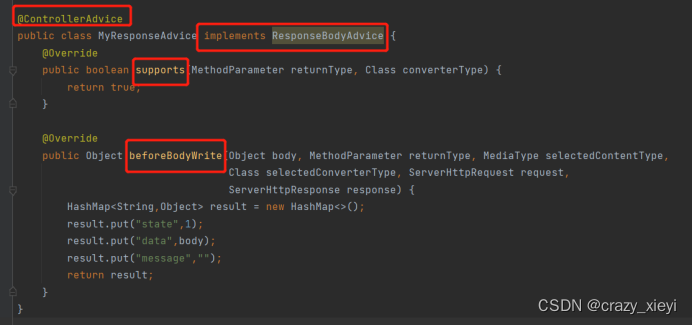 注意:support方法返回一个 boolean值,true表示返回数据之前对数据进行重写,也就是会进入下面 beforeBodyWrite方法。如果返回false,表示对结果不进行任何处理,直接返回数据。