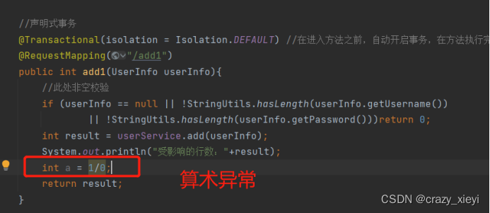 很明显,以上示例是能正常提交事务的,下面咱们手动构造一个算术异常,就可以通过查看数据库看到事务进行了回滚:代码如下(在以上基础上手动构造了一行算术异常)